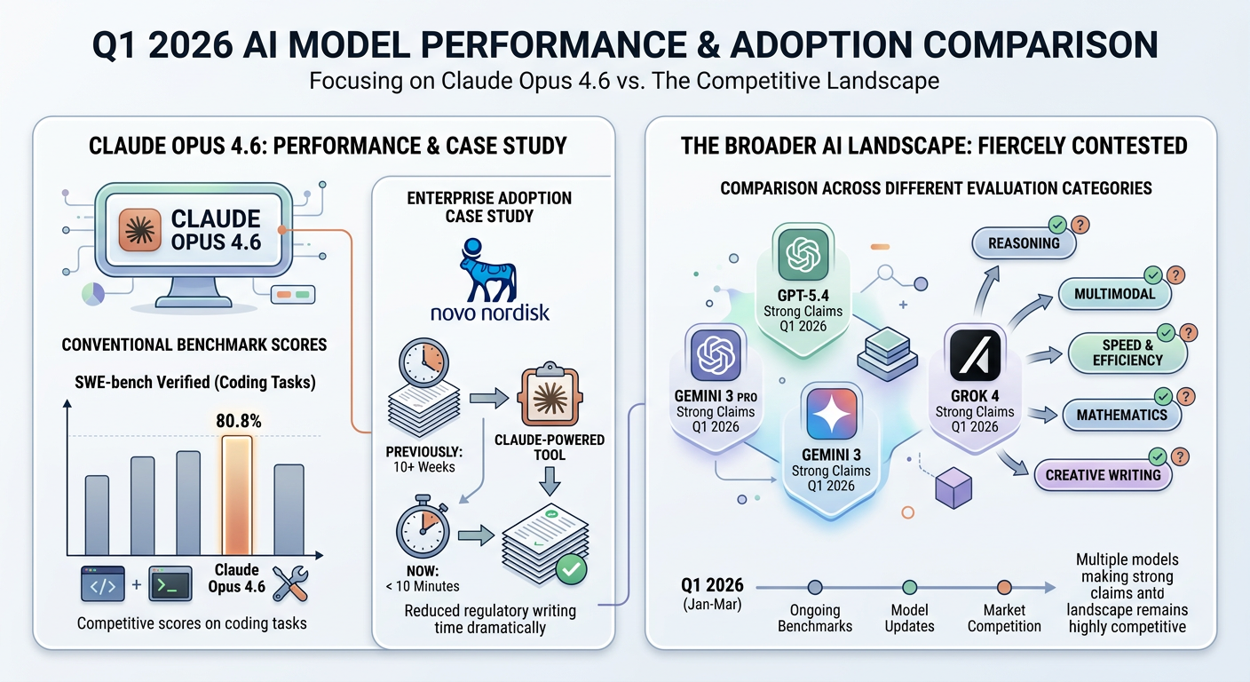 Novo Nordisk famously deployed a Claude-powered tool that reduced regulatory writing from 10+ weeks to under 10 minutes. Meanwhile, the broader AI model comparison landscape remains fiercely contested, with GPT-5.4, Gemini 3 Pro, and Grok 4 all making strong claims across different evaluation categories throughout Q1 2026.
