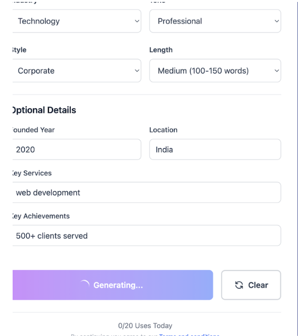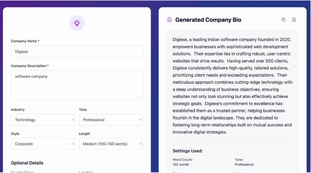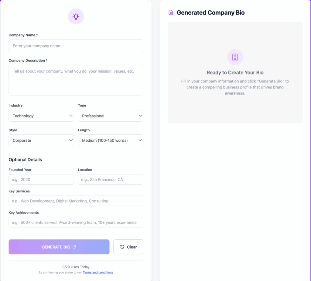 With just a few inputs—like your company name, description, industry, tone, and optional details—our AI generates a tailored bio that reflects your brand's identity, mission, and value proposition.