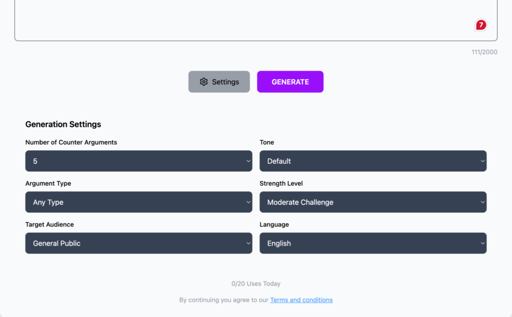 Simply input your opponent’s argument or topic, and let the AI produce persuasive counter arguments that are concise, impactful, and ready to use.