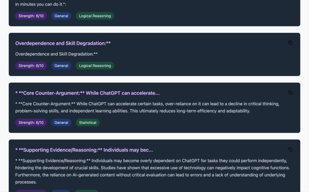 With one click, our AI produces a list of well-crafted counter arguments based on logical reasoning, rhetorical strategies, and contextual relevance.