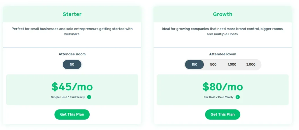 The Starter Plan is ideal for small businesses and solo entrepreneurs who are just starting with webinars. It includes all the basic tools needed to host live and automated webinars while keeping things simple and affordable.
