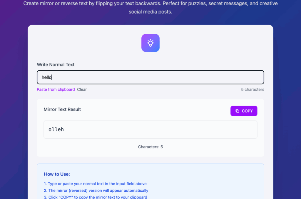 Create mirror or reverse text by flipping your text backwards. Perfect for puzzles, secret messages, and creative social media posts.