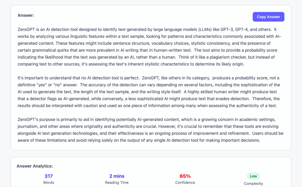 Whether you’re researching for a project, preparing for an exam, drafting content, or simply seeking quick answers to complex questions, this tool delivers reliable responses tailored to your needs. No matter the topic—academics, business, technology, or general knowledge—our AI provides clear, well-structured answers without the hassle of endless searching.