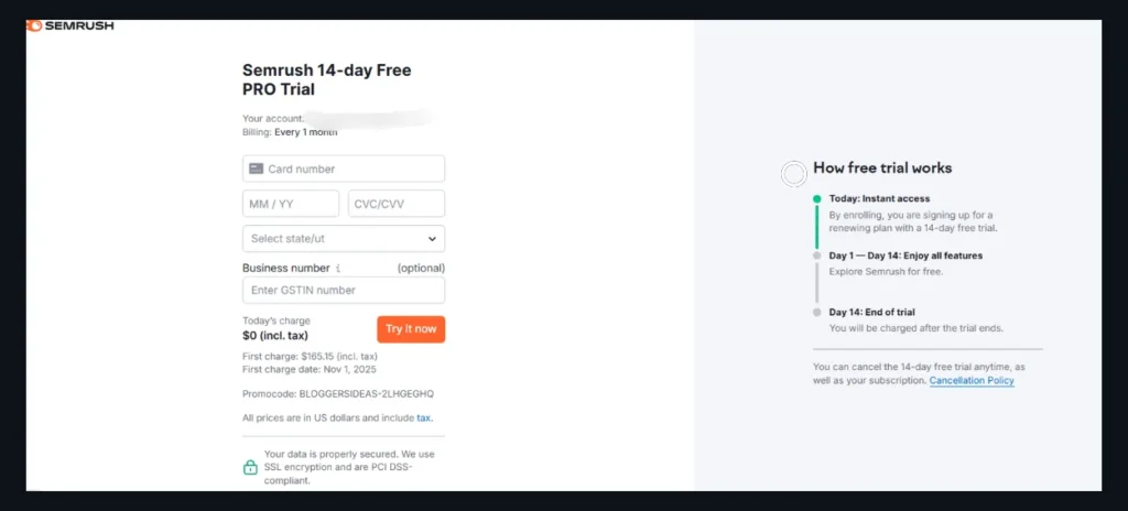 Note: As of 2025, Semrush offers a 7-day free trial. However, new users can get a 14-day free trial by signing up through our exclusive affiliate link. You won’t be charged during the trial period as long as you cancel on time.
