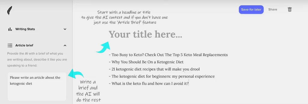 When you click the ‘Write for me‘ button, your AI looks at everything you have written in that document so far (including the title) and uses that to write the next sentence or paragraph for you.