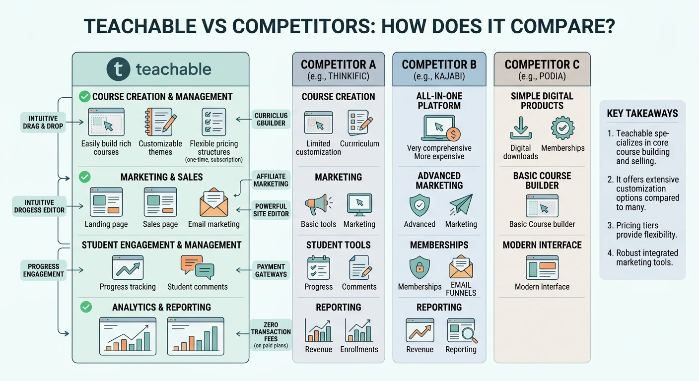 When comparing teachable vs competitors, Teachable stands out for its simplicity and strong set of built-in tools. Platforms like Thinkific, Kajabi, and Podia are also popular choices in the online course platform space, but Teachable is often preferred by first-time course creators for its clean interface and straightforward teachable pricing. If you want an honest look at how the platform stacks up, reading a teachable review from real users is always a good idea before you commit.
