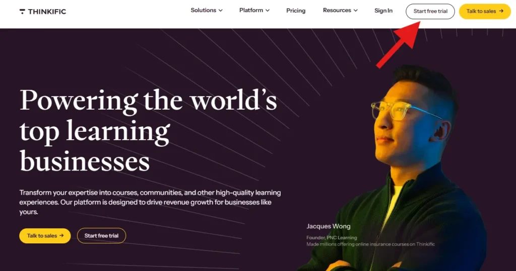 Step 1: Visit the Thinkific Website: Go to www.thinkific.com and click on “Start Free Trial” to begin.