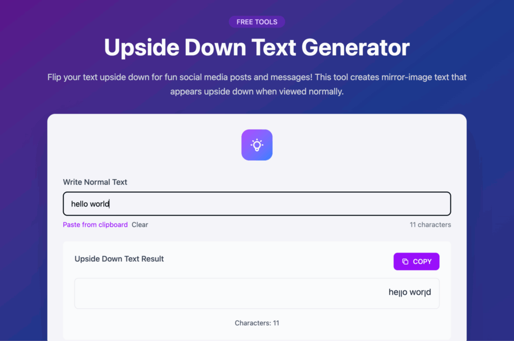 With one click, our AI converts your text into flipped, upside-down text, ready to use in your projects.