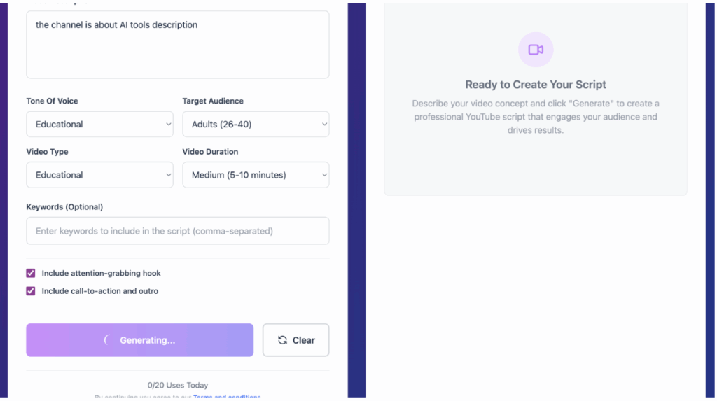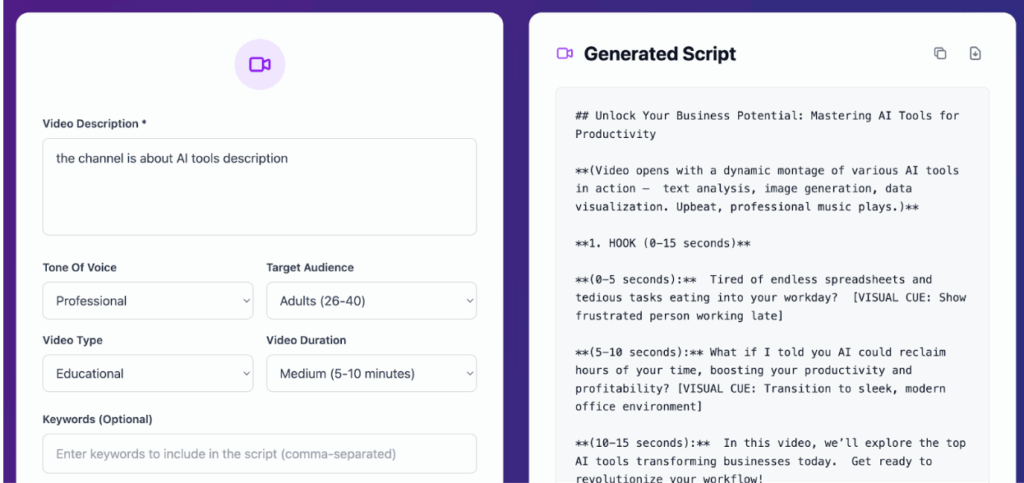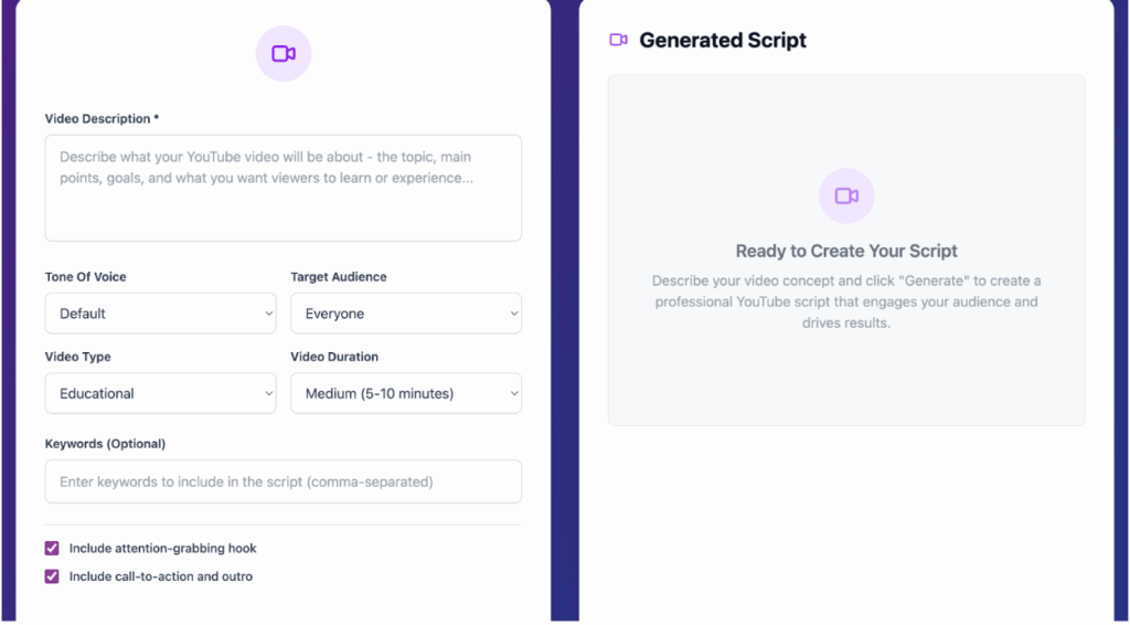 This tool is designed to eliminate writer’s block and give you a solid, professional script foundation tailored for your audience and niche—every single time.